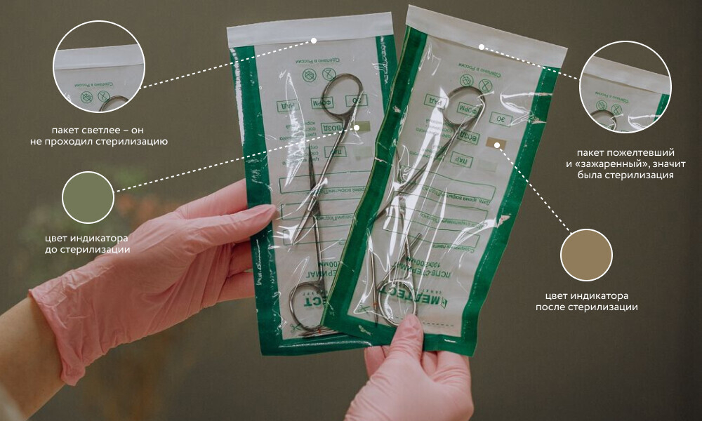 - На крафт-пакетах должен быть индикатор стерилизации, который поменял цвет после обработки.