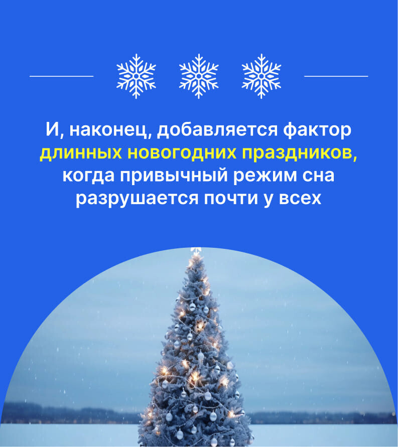 Из-за этого возникает парадоксальное состояние: формально человек спал достаточно, но восстановление оказалось неполным. К этому добавляется расшатанный режим после праздников – поздние отходы ко сну, попытки «доспать» утром или в выходные, что еще больше сбивает циркадные часы.