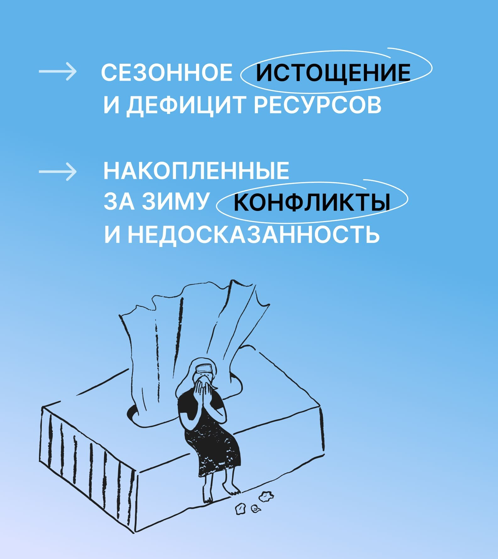 К этому добавляется эффект накопленных за зиму напряжений. В холодное время года пары больше времени проводят в замкнутом пространстве, реже переключаются на внешние активности, и это усиливает как конфликты, так и замалчивание проблем.