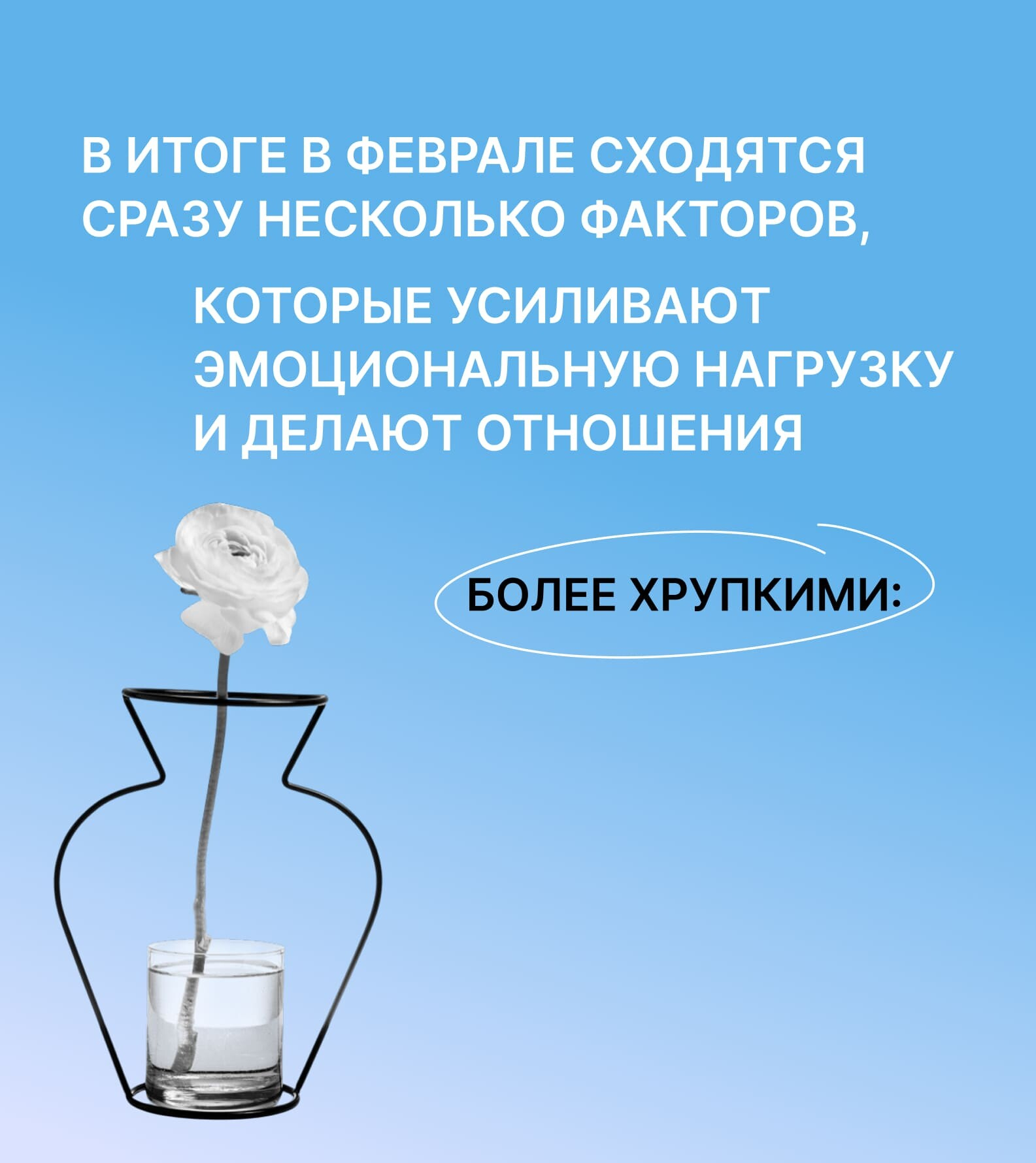 «Февраль – это момент, когда человек осознает, что ничего не изменилось само по себе. Отношения не стали глубже, близость не появилась автоматически, и это вызывает разочарование».