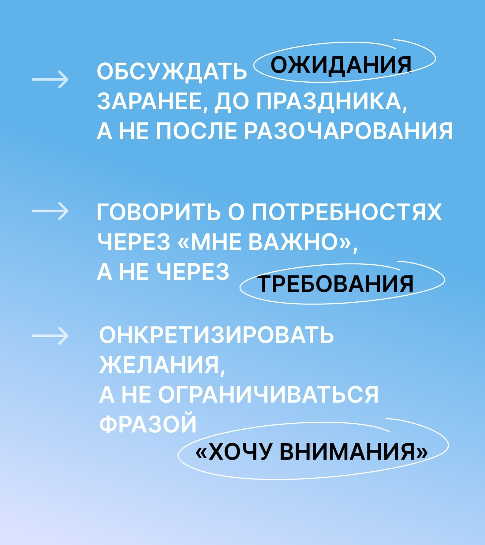 Еще один рискованный момент – молчание перед праздником. Непроговоренные ожидания накапливаются и создают внутреннее напряжение, которое в праздничный день легко «взрывается».