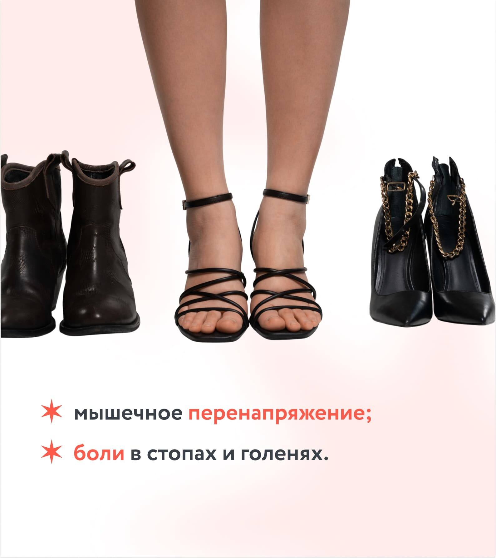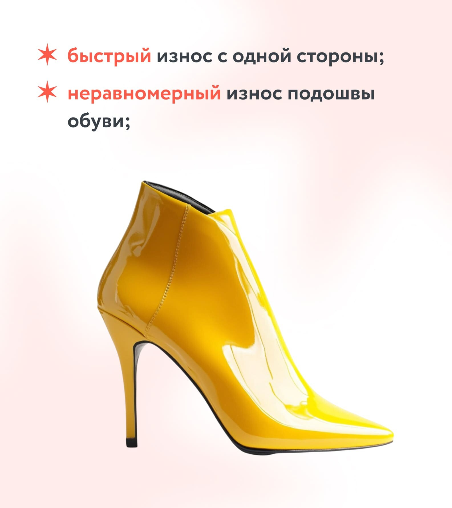 «При увеличении высоты каблука нагрузка на передний отдел возрастает, что может приводить к его перегрузке и деформации», – подчеркивает специалист.