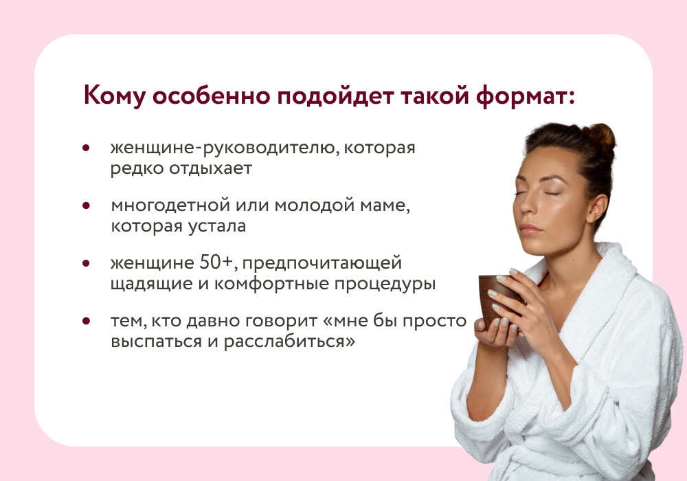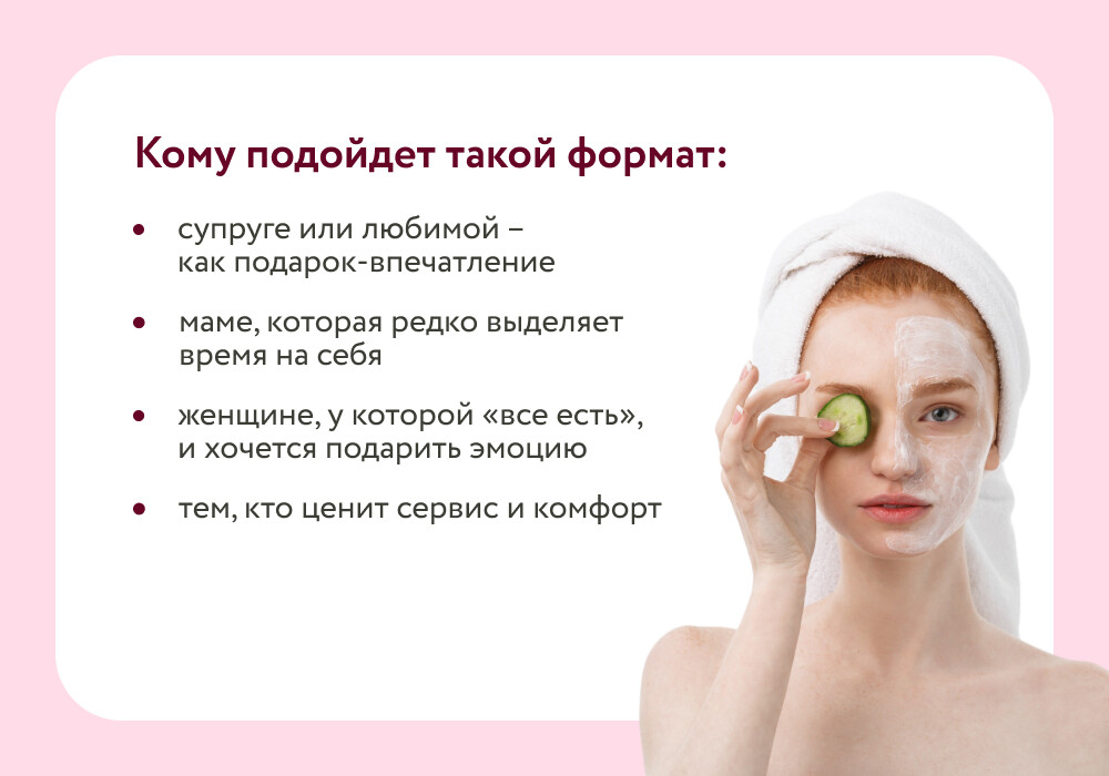 Иногда одного сертификата на конкретную процедуру кажется мало. Хочется, чтобы у близкого человека случился не просто визит в салон, а полноценный «день для себя» – без спешки, с ощущением заботы и внимания. Так, женщина проведет несколько приятных часов в атмосфере ухода и расслабления.
