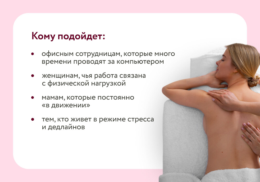 Один из самых безопасных и универсальных вариантов подарка – это массаж. Он не требует подготовки, не связан с изменением внешности и подходит женщинам разного возраста. После массажа уходит ощущение зажатости в плечах, тяжесть в спине, становится легче двигаться и думать.