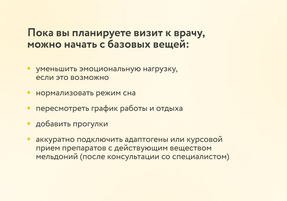 Первично можно обратиться к неврологу или терапевту. Задача врача – исключить соматические (телесные) причины усталости: заболевания сердца, щитовидной железы, желудочно-кишечного тракта, анемию, онкологические процессы.