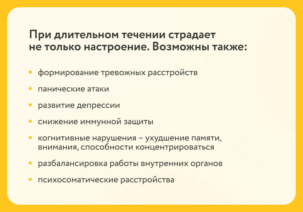 «При затянувшихся месяцами симптомах время может быть упущено. Астения может перейти в хроническую фазу с формированием тревожных расстройств, панических атак и депрессии», – предупреждает Татьяна Гарустович.