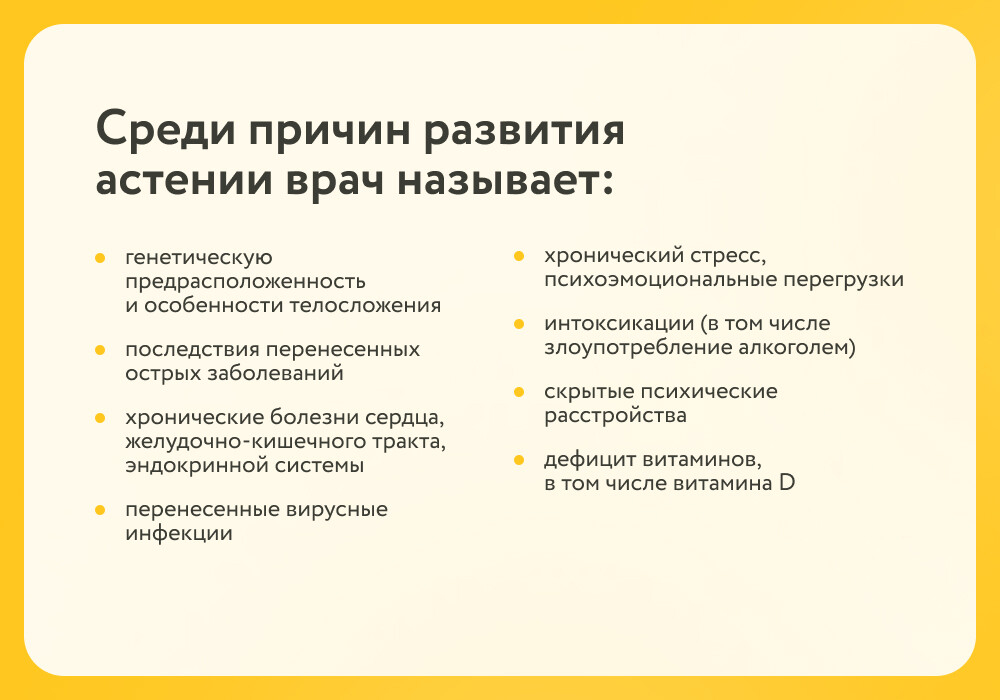 «Проявления астении продолжительны, они не исчезают даже после полноценного отдыха», – подчеркивает врач.