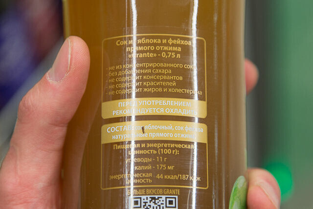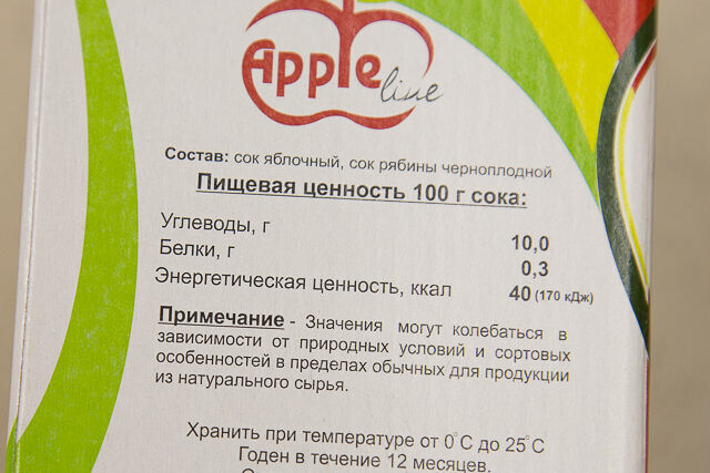 — Вот отличный продукт — сок яблочный с черноплодной рябиной. Ягода полезна людям с повышенным давлением, заболеваниями сердца и сосудов. К тому же стоит сок недорого. Российский бренд также отличается хорошим составом. Видите, на пачке написано «содержит сахар природного (естественного) происхождения».