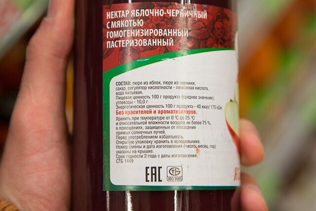 Следующий — нектар яблочно-черничный с мякотью гомогенизированный.