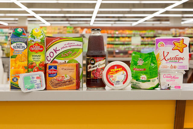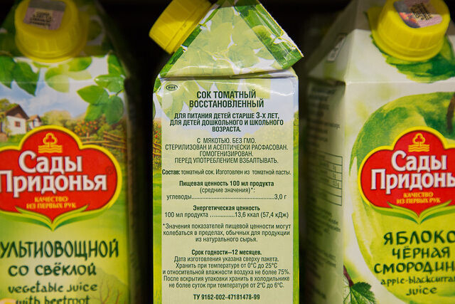 Диетолог внимательно изучает витрины и выбирает томатный сок российского бренда. Он восстановленный, но не содержит соли.