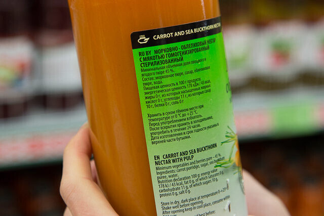 — Например, в этом морковно-облепиховом доля овощного и ягодного пюре — 45%. Значит, остальное вода. Это нектар. Производитель честно подтверждает информацию на этикетке. Если любите нектар, пожалуйста. Если хотите настоящий сок, лучше такой не выбирать.
