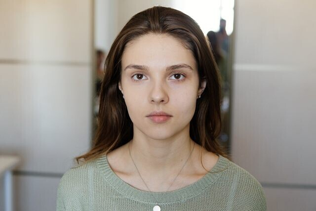 Алеся рассказывает, что в макияже следующей модели выбирает такие же универсальные цвета, что и в первом случае. Отличие в том, что рельеф кожи Анастасии более гладкий, поэтому тон ляжет лучше. Кроме того, не понадобится смесь тональных средств, так как высветлять лицо не надо. Не будет использоватся и хайлайтер, потому что кожа этого не требует.