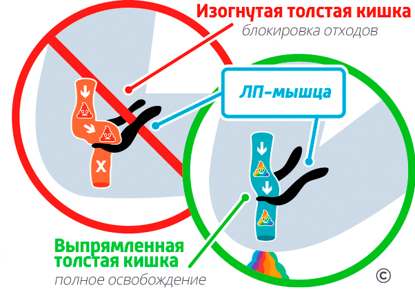 В организме все продумано. Специальная ЛП-мышца (лобково-прямокишечная) пережимает прямую кишку, когда человек стоит. Именно поэтому опорожняться в таком положении практически невозможно. Сдерживает она испражнения и когда человек лежит, ходит, бегает, работает — то есть эта мышца нам в действительности очень помогает! Если сесть, ЛП-мышца расслабляется наполовину. А вот позиция «на корточках» расслабляет мышцу полностью, и прямая кишка выравнивается.
