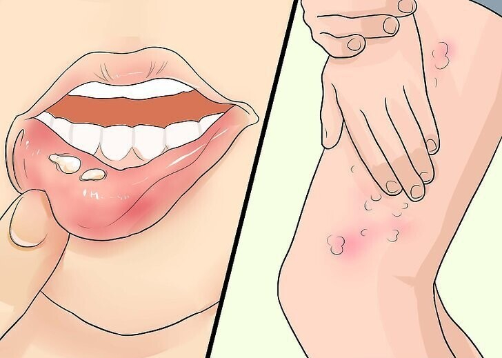 Болезнь характеризуется появлением болезненных высыпаний — маленьких или больших пузырьков, которые вызывают сильный зуд. Частое явление в осенне-зимний период — «простуда на губах». Это одно из проявлений вируса простого герпеса. При снижении иммунитета происходят рецидивы заболевания.