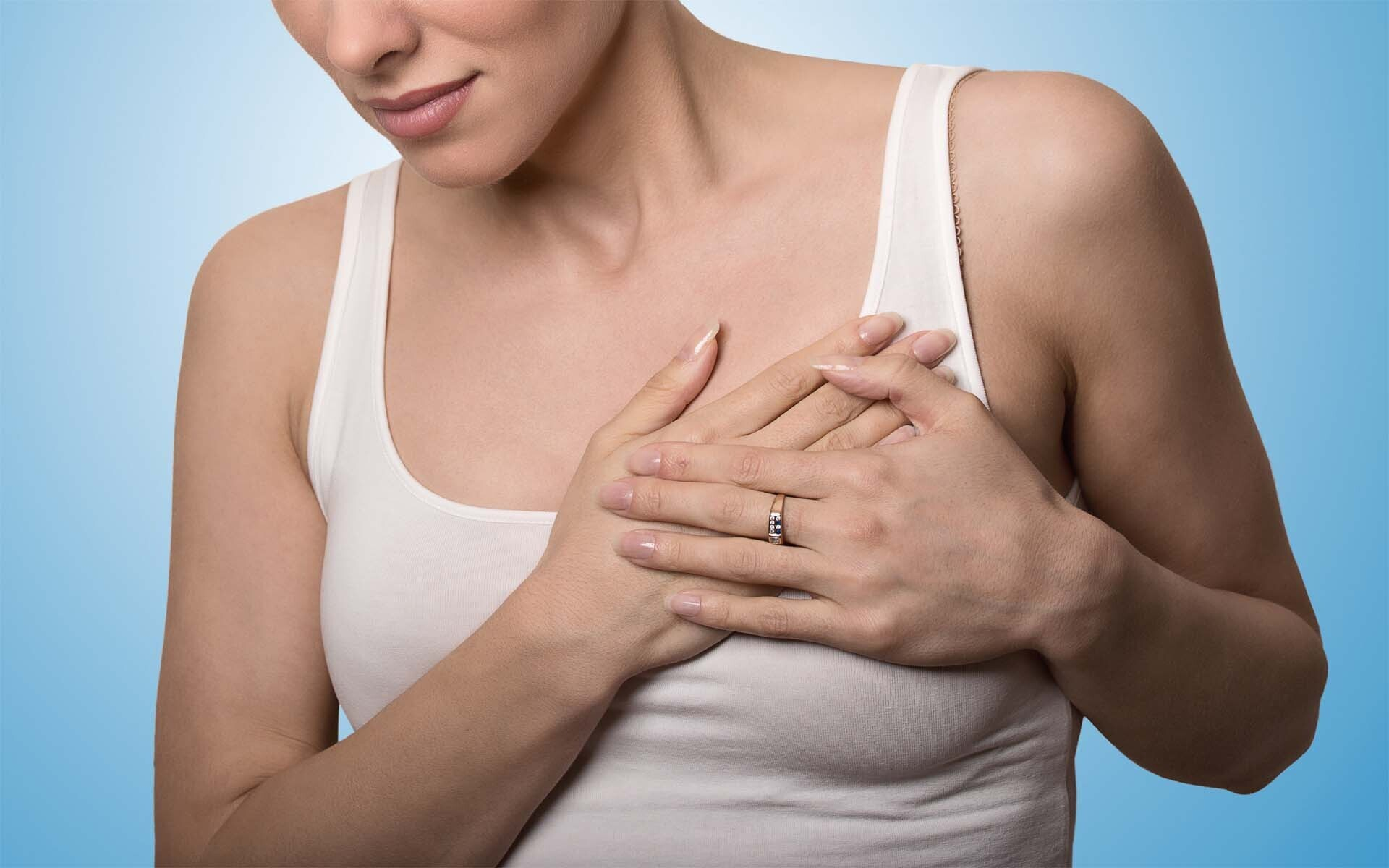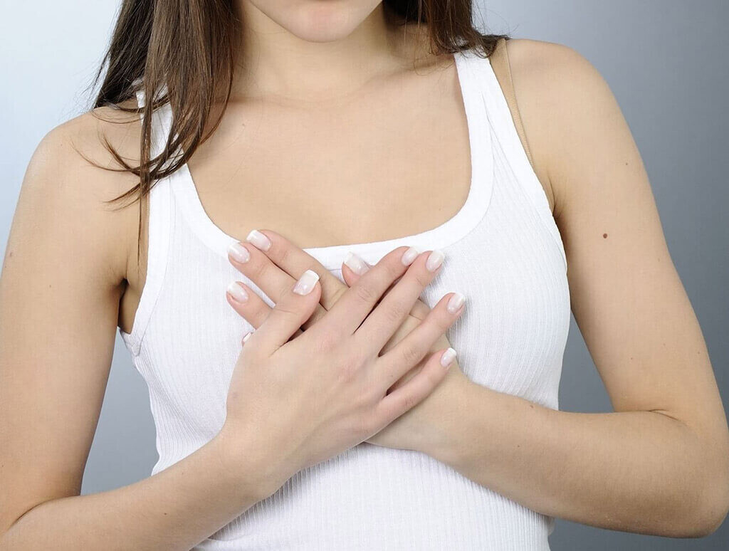 - боли в груди, которые могут отдавать в спину или плечо и появляются вне зависимости от дня менструального цикла;