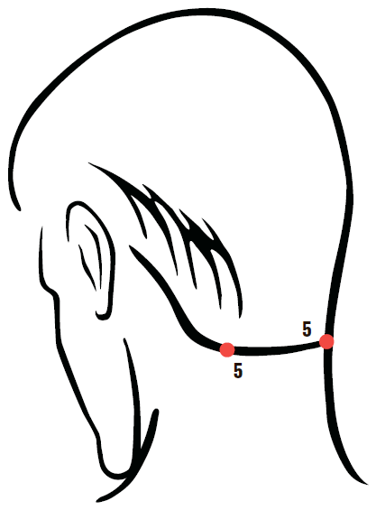 5. На затылочной границе роста волос, в углублении у наружного края трапециевидной мышцы находятся симметричные точки, массировать которые нужно подушечками средних пальцев надавливающими и растирающими движениями в течение 2–3 минут.