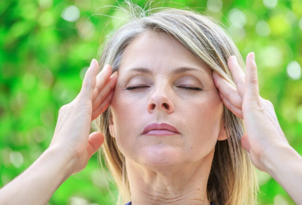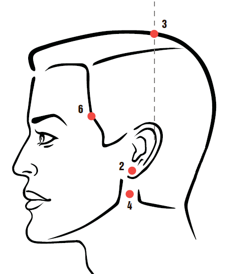 6. При боли в висках массируйте подушечками средних пальцев симметричные точки, расположенные в небольших углублениях на височной границе роста волос на линии бровей в течение 2–3 минут.
