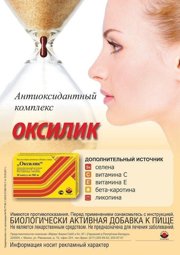 Сбалансированный антиоксидантный комплекс можно приобрести в аптеке. Регулярный прием антиоксидантов помогает замедлить старение кожи и образование морщин, защищает от последствий воздействия неблагоприятных факторов окружающей среды (УФ-излучение, смог) и положительно влияет на весь организм.