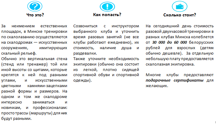 В Минске сразу несколько клубов и объединений предоставляют новичкам шанс попасть на скалодромы и приобщиться к интереснейшему занятию. Большинство из них дает возможность как разовых занятий с инструктором, так и приобретения абонементов для взрослых и детей, а также записи в соответствующие секции.