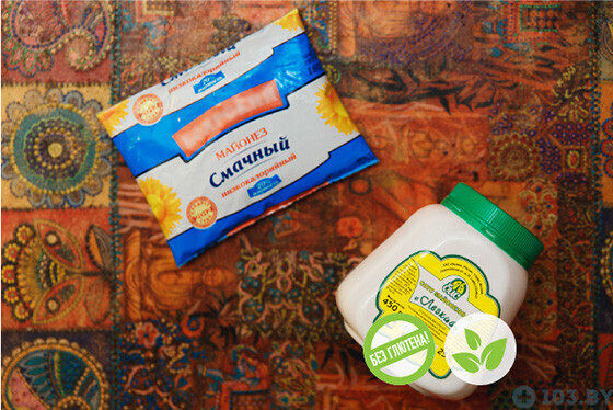 В соседнем холодильнике ищем замену самому «гонимому» продукту приверженцев здорового питания: у нас в корзине майонез. В качестве здорового аналога нам предлагают продукт с тем же названием, но принципиально иным составом и жирностью всего 25%. Отсутствие яиц (или яичного порошка) — очередная хорошая новость для страдающих аллергией.