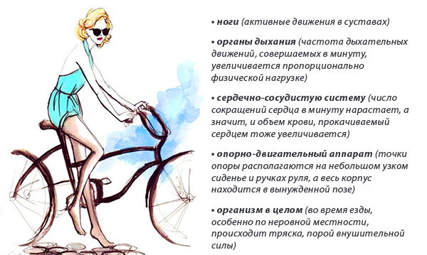 Велопрогулки в целом оказывают благотворное влияние на организм здорового человека: поддерживают тонус мышц, активизируют обменные процессы, увеличивают поступление кислорода к тканям, способствуют укреплению организма и его устойчивости к заболеваниям. Но все это верно лишь при ряде условий: правильно подобранный и отрегулированный велосипед, рациональная поза, сбалансированные нагрузки и отсутствие проблем со здоровьем. Чтобы понять, какой вред может нанести самое здоровое из средств передвижения, рассмотрим, что происходит с организмом человека во время езды на велосипеде? Основная нагрузка ложится на: