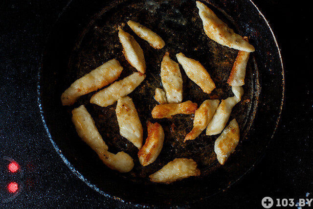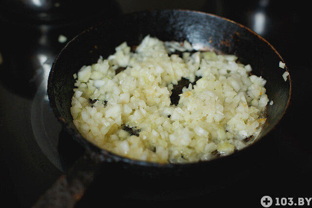 — Мелко нарезаем лук, затем обжариваем его на топленом сливочном масле до золотистой корочки. Использование такого масла даст не только более нежный вкус, но и не навредит печени. Если дома нет топленого сливочного масла, можно брать оливковое, оно также намного полезнее подсолнечного.