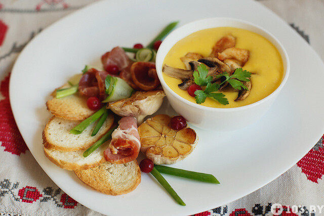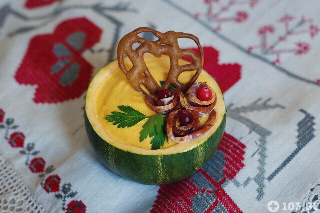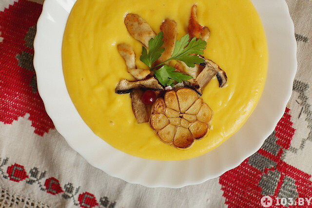 — Супы-пюре появились в Беларуси только в XIX веке. Первые рецепты пришли из Франции, после войны 1812 года. В нашей стране супы-пюре готовили в различных вариантах, в том числе из тыквы, картофеля и моркови. Мы приготовим тыквенный суп отдельно для дам и для мужчин. Женский вариант будет легким и нежным, мужской — сытным и брутальным.
