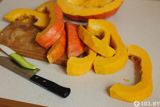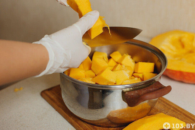 Вначале нужно вымыть и очистить от кожи тыкву, затем порезать ее на небольшие кусочки, положить в кастрюлю и варить около 15 минут. Время варки зависит от сорта овоща. Иногда требуется меньше времени.