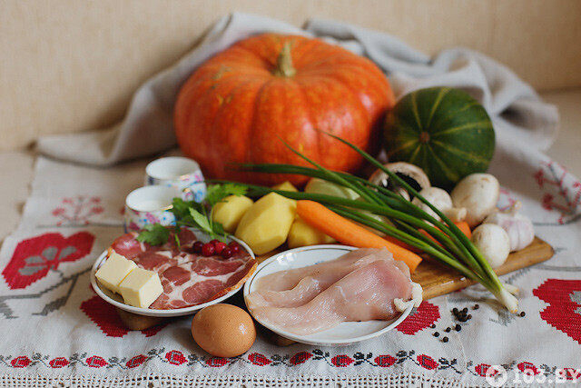 — Сегодня будем готовить три блюда из тыквы. Процесс приготовления займет около 3 часов. Общим ингредиентом будет тыква. Для супа также понадобится картофель, морковь, сливки, сметана, лук, чеснок, мясо птицы, для декора нарезка из свиной шейки, а также шампиньоны и хлебные гренки.