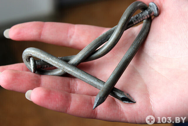 Андрей согнул в своеобразное сердечко двухсотые толстенные гвозди.
